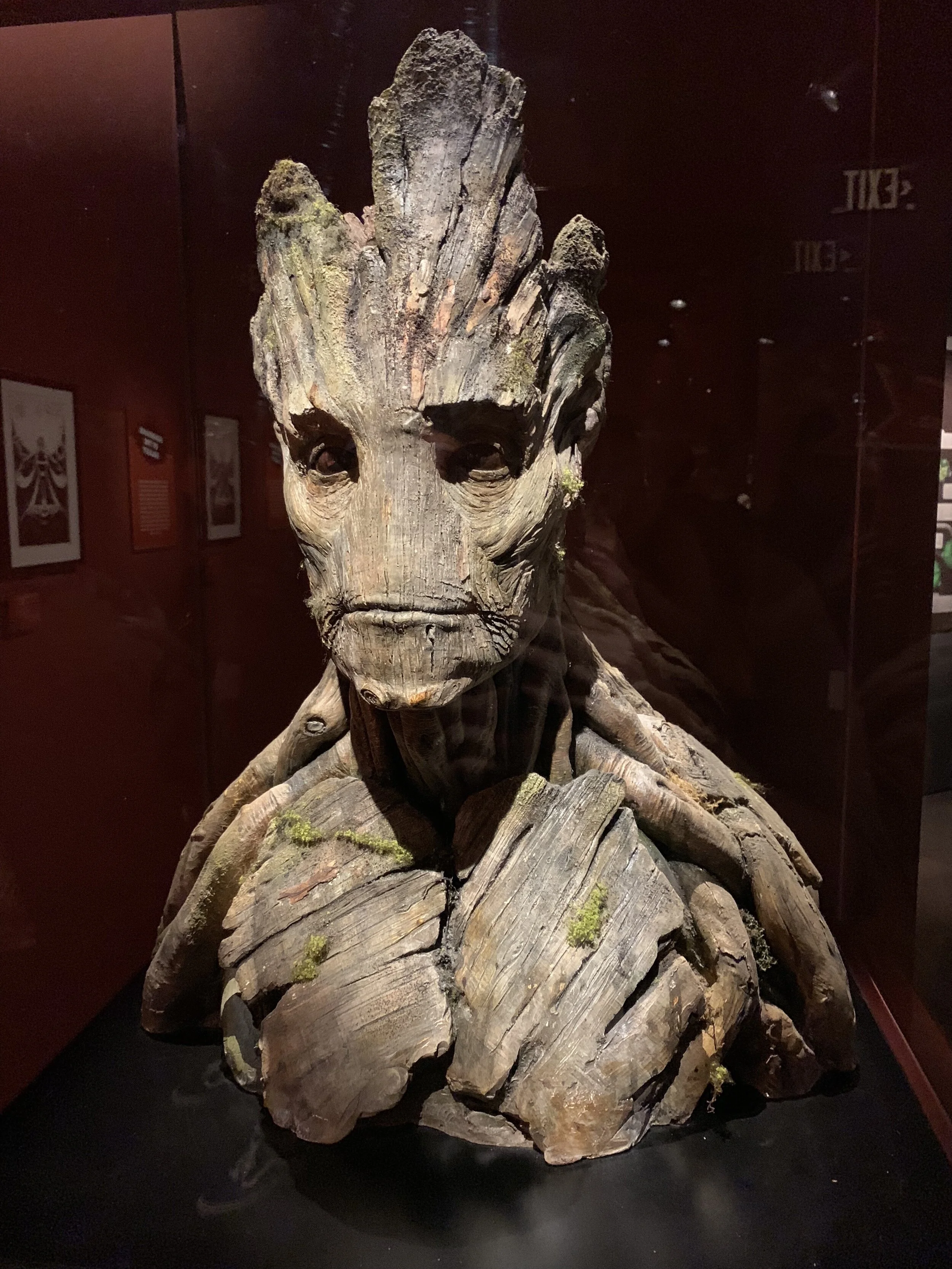 To zdanie może mieć miliony znaczeń. Zależnie od tego jak jest wypowiedziane. To jedna z cech, za którą tak lubimy tą postać. Ucieszyłam się, wchodząc do sekcji wystawy poświęconej Guardians of The Galaxy, że można było znaleźć tam Groota! To jedna z moich ulubionych postaci z tego filmu, i Rocketa też lubię, Gamora też jest super, no i Star Lord – heloł! No dobra, poddaję się, wszyscy są świetni! Postać Groota widoczna w filmie została stworzona całkowicie przy użyciu efektów komputerowych, jednakże artyści pracujący nad postacią potrzebowali swego rodzaju modela, podstawy wyglądu postaci, do której mogliby wracać. Tak powstał ten przepiękny model Groota.
